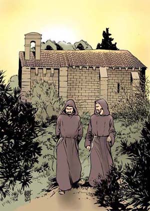 Ao aproximarem-se de Sena, alguns habitantes vêm ao seu encontro. Estes foram avisados por viajantes mais rápidos do que os nossos amigos e anunciaram esta nova: «O santo homem de Assís vem a caminho com um dos seus companheiros». As pessoas deitam-se então aos pés do dois irmãos menores, muito atrapalhadas. «Venham depressa! Estavam sieneses combatendo por causa de mulheres, à mistura com uma estranha história de dinheiro. Já houve dois mortos e vai continuar se nada é feito para trazer a paz.» Francisco e Masseu aceleram o passo e dirigem-se para o meio da multidão. Gritos, insultos, pancadas, sangue a correr. Eis o espetáculo de horror que descobrem ao chegar. «Párem, habitantes de Sena! Párem e ouçam!» grita Francisco. «Ouçam esta parábola».