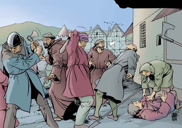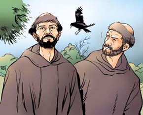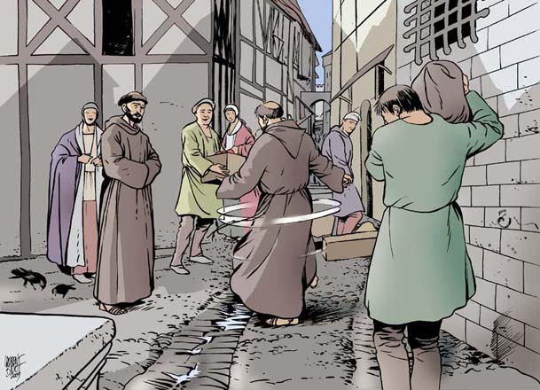 Ao aproximarem-se de Sena, alguns habitantes vêm ao seu encontro. Estes foram avisados por viajantes mais rápidos do que os nossos amigos e anunciaram esta nova: «O santo homem de Assís vem a caminho com um dos seus companheiros». As pessoas deitam-se então aos pés do dois irmãos menores, muito atrapalhadas. «Venham depressa! Estavam sieneses combatendo por causa de mulheres, à mistura com uma estranha história de dinheiro. Já houve dois mortos e vai continuar se nada é feito para trazer a paz.» Francisco e Masseu aceleram o passo e dirigem-se para o meio da multidão. Gritos, insultos, pancadas, sangue a correr. Eis o espetáculo de horror que descobrem ao chegar. «Párem, habitantes de Sena! Párem e ouçam!» grita Francisco. «Ouçam esta parábola».