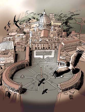 A primeira fase é comum a todos os homens, ou seja a cada indivíduo, que seja cristão, membro doutra religião, adepto duma seita, ateu ou adversário incondicional da Igreja de Cristo, tem uma alma espiritual, imortal, criada por Deus. A segunda fase é própria aos justos, que, pela sua vontade, levam a alma a uma criação ainda mais completa, unindo as suas boas ações à bondade do trabalho de Deus. Fazem-se portanto uma alma já mais perfeita espiritualmente do que aquelas que ficam na primeira fase. A terceira é própria para os bem aventurados, pars os santos, que fazem crescer de mil e um graus a alma que tinham à partida, uma alma simplesmente humana, e fazem dela uma alma capaz de ficar em Deus * Segundo Centro Editoriale Valtortiano, Isola del Liri, Italie, O Evangelho como me foi revelado, Maria Valtorta, Volume 3, cap. 65, p. 383 e 384 (extrato).. Para compreender melhor esta progressão, podemos avocar o símbolo do edifício religioso que o mundo inteiro conhece: o de São Pedro de Roma. A sua grande praça, primeiro, ornada e robusta, introduz o peregrino na área do edifício. Esta é defendida por duas gigantescas séries de colunas implantadas em círculo, como se se tratasse dum muro defensivo dum castelo fortificado. Da mesma maneira, é necessá saber proteger a alma, rainha dum corpo, que é o templo do Espírito eterno, duma barreira que a defende sem no entanto lhe cortar a luz. Estas duas séries de colunas que tentam juntar-se estão no entanto abertas na sua extremidade, como para significar que esta cercada, construida para proteger o edifício, é um misericórdioso refúgio para os mais infelizes que não sabem o que é a caridade. Para aceder ao edifício, à segunda fase, o peregrino deve percorrer esta praça (esta é de fato inclinada) e depois, imponentes escadas. Esta subida simboliza a libertação do espírito na carne. Deixamos em baixo tudo o que pesa para subir para o que é superior: o espírito. Ao cimo das escadas, o peregrino chega por baixo do nártex, o lugar dos catecúmenos, símbolo da efusão do amor, da piedade, do desejo que os outros vêm a Deus. Enquanto a praça permanece submetida às intempéries naturais (o sol de chumbo ou a chuva) este nártex é como um véu colocado por cima do berço dum órfão. Depois, além das portas, as mais belas esculturas em homenagem ao Criador. Numerosos passos restam ainda para percorrer para chegar à encruzilhada dos transeptos * A representação da Trinidade dada neste lugar pelo artista merece ser notificada: lá em cima, debaixo da cúpula, Deus Pai. Não sai dos céus; Mais abaixo, no teto do baldaquino, o Espírito é representado sob a forma dum pombo mas também pelo movimento que o artista deu às tapeçarias de bronze do baldaquino: o sopro do Espírito que age; Em baixo, no altar, Deus que se dá em Jesus Cristo pela operação do Espírito Santo: a Eucaristia, o corpo e o sangue do Cristo. e apresentar no altar a sua oferta de virtudes. É aqui, no altar, que Deus se torna presente no Santo Sacrifício da missa e que a alma humana é convidada a comungar física e espiritualmente com Deus.